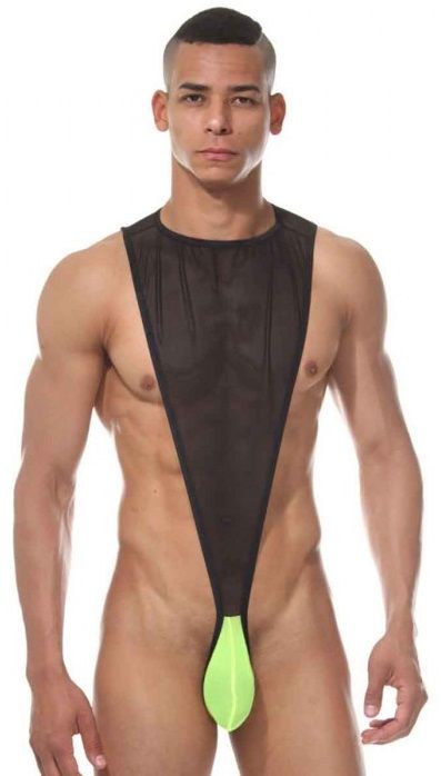 Оригинальное боди для мужчин, в котором скомбинирована верхняя полупрозрачная с контрастным гульфиком.