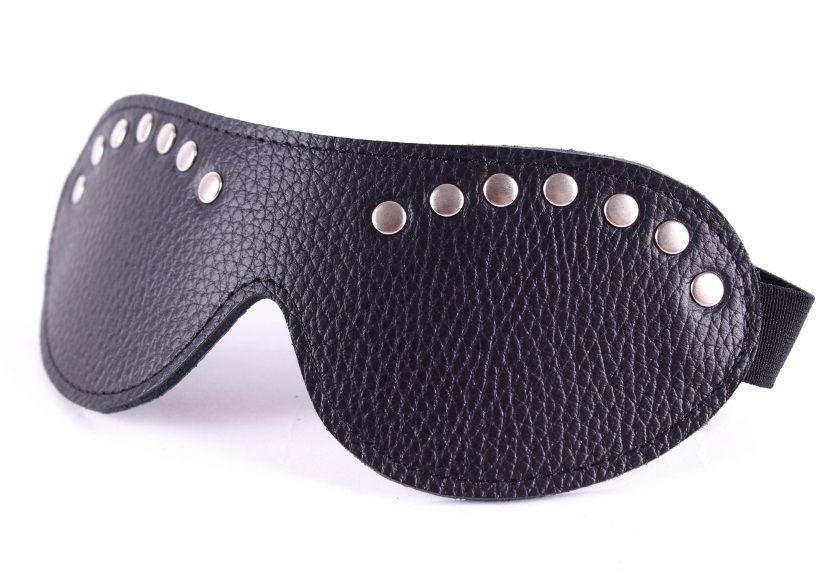 Черная маска из кожзама, декорированная заклепками. Крепится к голове при помощи удобной резинки. Длина маски - 19,5 см., ширина - 7 см.