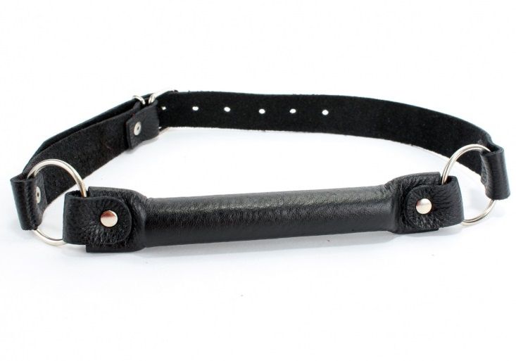 Черный кожаный кляп с цилиндрическим брусочком для рта.