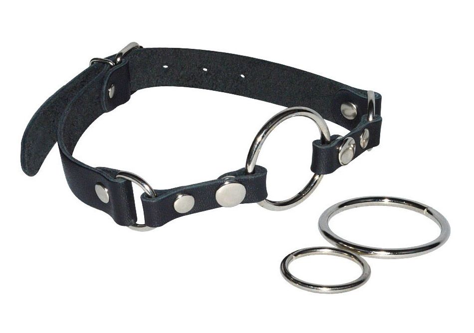 Кляп-рамка изготовлен из натуральной высококачественной кожи чёрного цвета. Особенностью данного девайса являются сменные кольца, которые легко отстегнуть при помощи кнопок. Зафиксировать и отрегулировать изделие можно при помощи металлической пряжки. Вся металлическая фурнитура имеет никелевое покрытие. Диаметр колец - 3,8, 4,4 и 5,9 см.