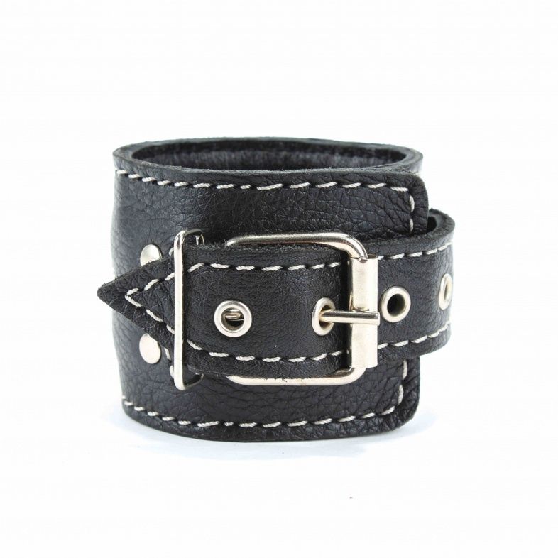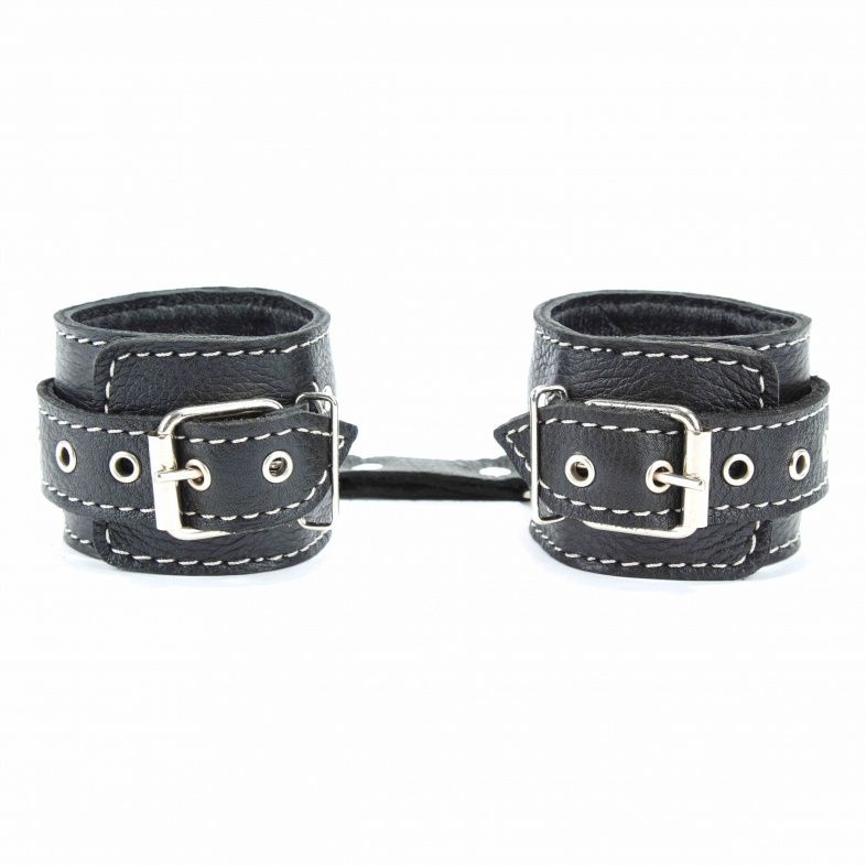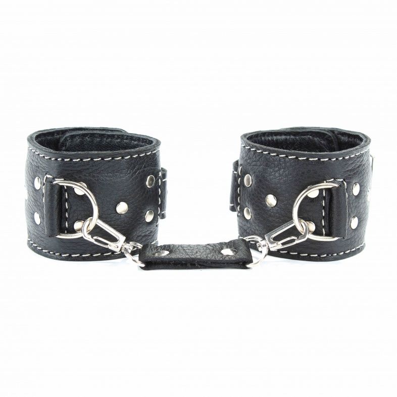 Чёрные кожаные наручники с крупной строчкой.